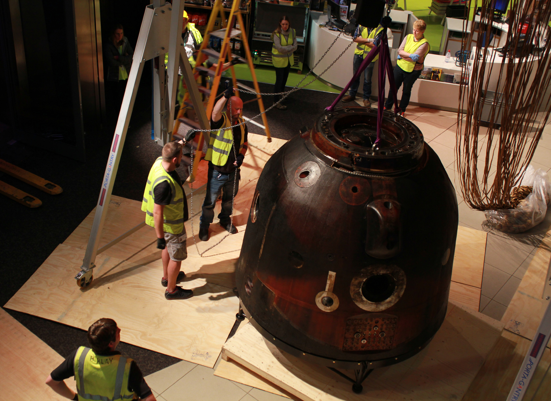 After testing out various locations, we decided that the main foyer was the best place for Soyuz (before this, the foyer hadn’t been used to display an object for many years). We’re lucky to have an open staircase which goes up to the sixth floor of the building, with balcony areas as well—so not only can you see the capsule on the ground floor, you can look at it from above too, and see through its small round window. Using our foyer area also means that people can see this amazing spacecraft as soon as they enter the museum.