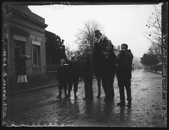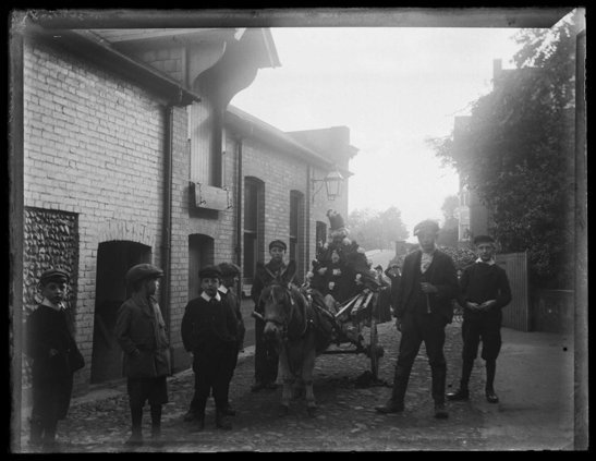 This photograph was taken by Edgar Tarry Adams (1852–1926), a wealthy and dedicated amateur photographer. It depicts a group of brewery workers’ children in Halstead, Essex, leading a pony and cart carrying an effigy, probably of Guy Fawkes.