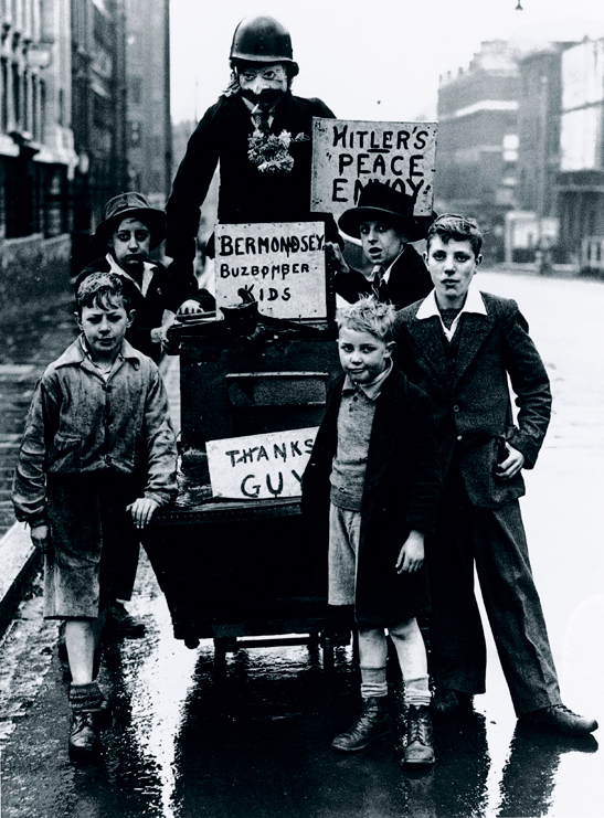 The children in this photograph from 1944 are celebrating Guy Fawkes day with a politically significant guy, labelled ‘HITLER’S PEACE ENVOY’. The other sign, ‘BERMONDSEY BUZBOMBER KIDS’, refers to the Buzz Bombs dropped on London during World War II. Buzz Bombs were another name for Doodlebugs, the German V1 flying bombs.