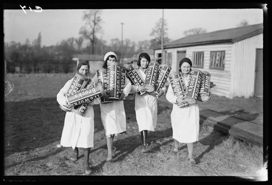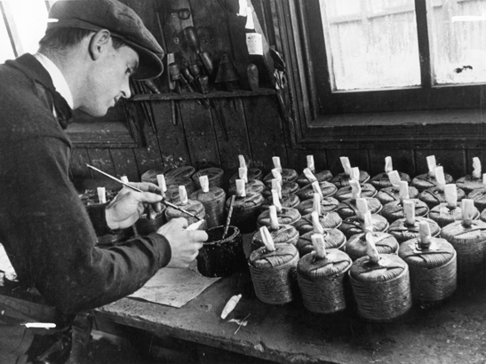 The workforce at Brocks were mostly women, employed seasonally. Those who worked with gunpowder wore black boilersuits, while packers wore white overalls. Founded in London in 1725, Brocks produced rockets, roman candles and special set piece fireworks for displays. They moved to a 200-acre site in Cheam in 1901, and continued manufacturing there until 1934. At one time the largest fireworks factory in the world, Brocks’ many small workshops and stores were dispersed across the site to minimise the danger of accidental explosions.