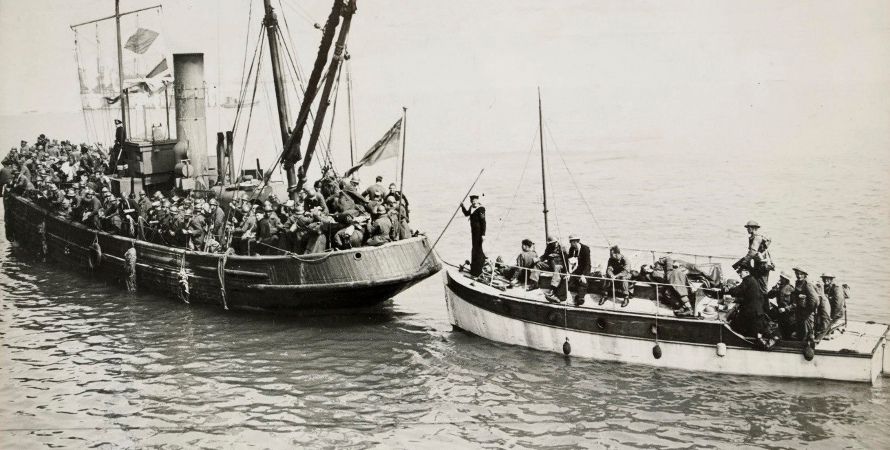 “On the left a human chain is seen struggling out from the beach to one of the many ships which carried Allied troops safely to England.”