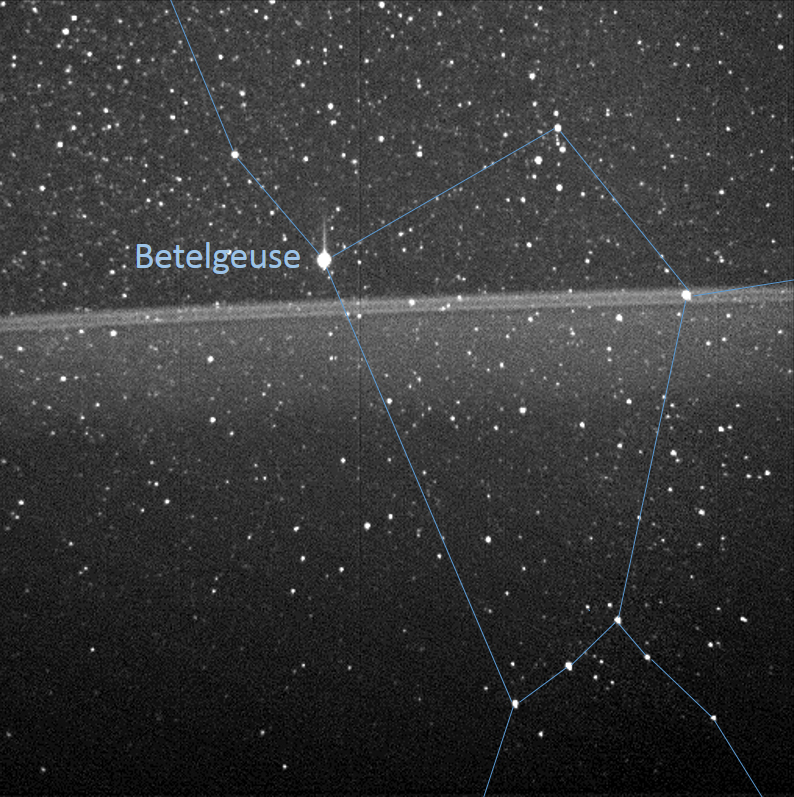 The brightest blob above the ring’s band of light is Betelgeuse, a star that makes up part of the Orion constellation. Three bright stars in a line form Orion’s belt in the bottom right corner of the image.