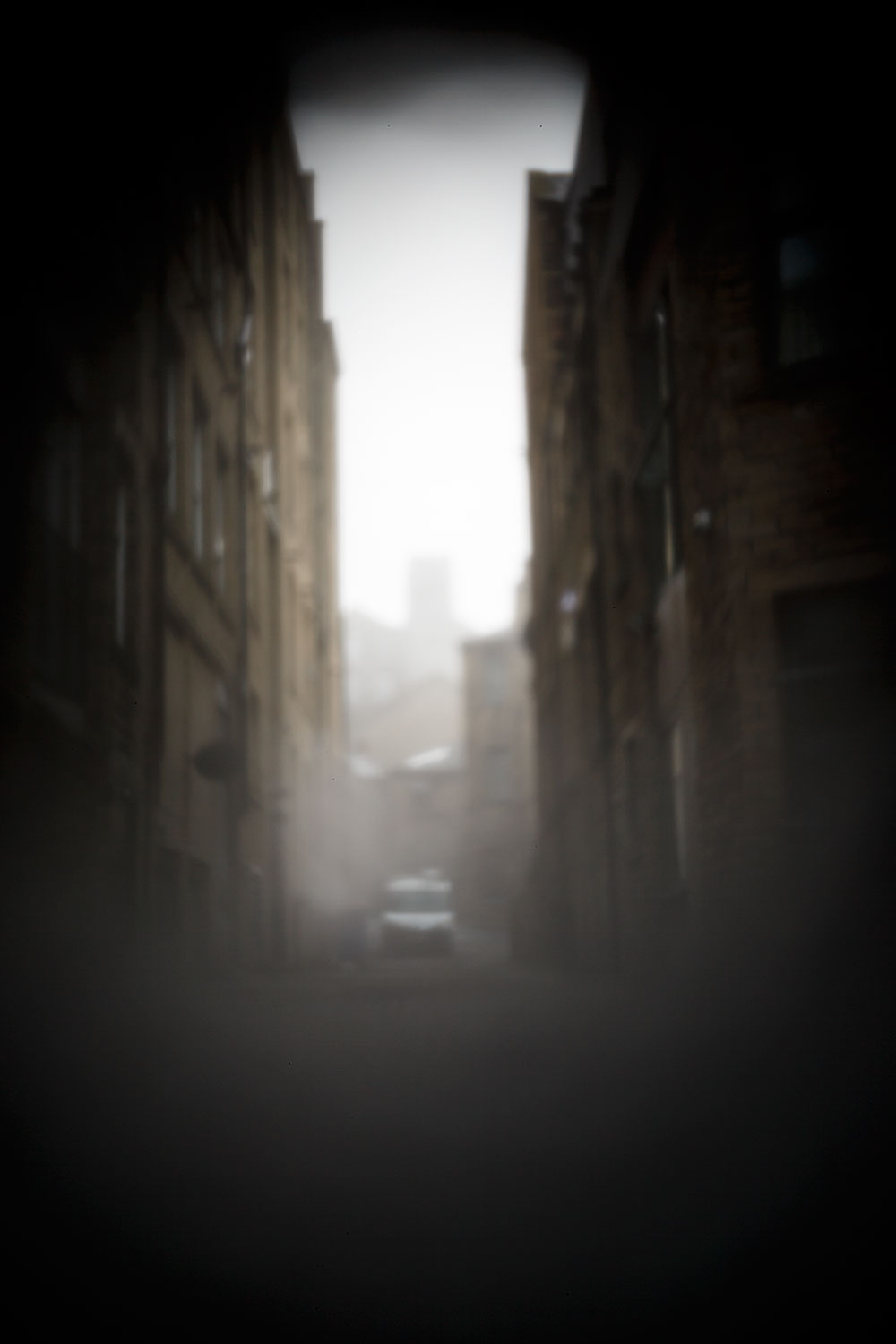 There is a wealth of material from which to choose; it is hard to pick favourites on a quick viewing (this is a show that will repay repeat visits). Once I was over the initial shock that such good quality images could be made using such a simple process, I looked for images that showed the technique to its full advantage. For me, the most compelling were those made this year by the students of Bradford College and members of the Bradford Photographic Society. Grouped together, they form an almost installation-like collection of images of Bradford. I particularly liked the black-and-white studies, the vignetting and lack of absolute sharpness adding to the slightly mysterious atmosphere they induce.
