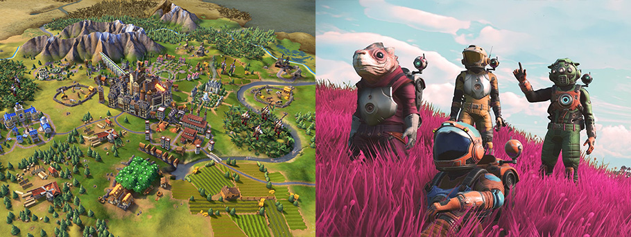 Civilisation’s ‘hotseat’ mode allows players to explore and conquer from one console (or PC), whereas No Man’s Sky’s exploration is almost endless, offering 18 quintillion worlds for you to discover online with your friends.
